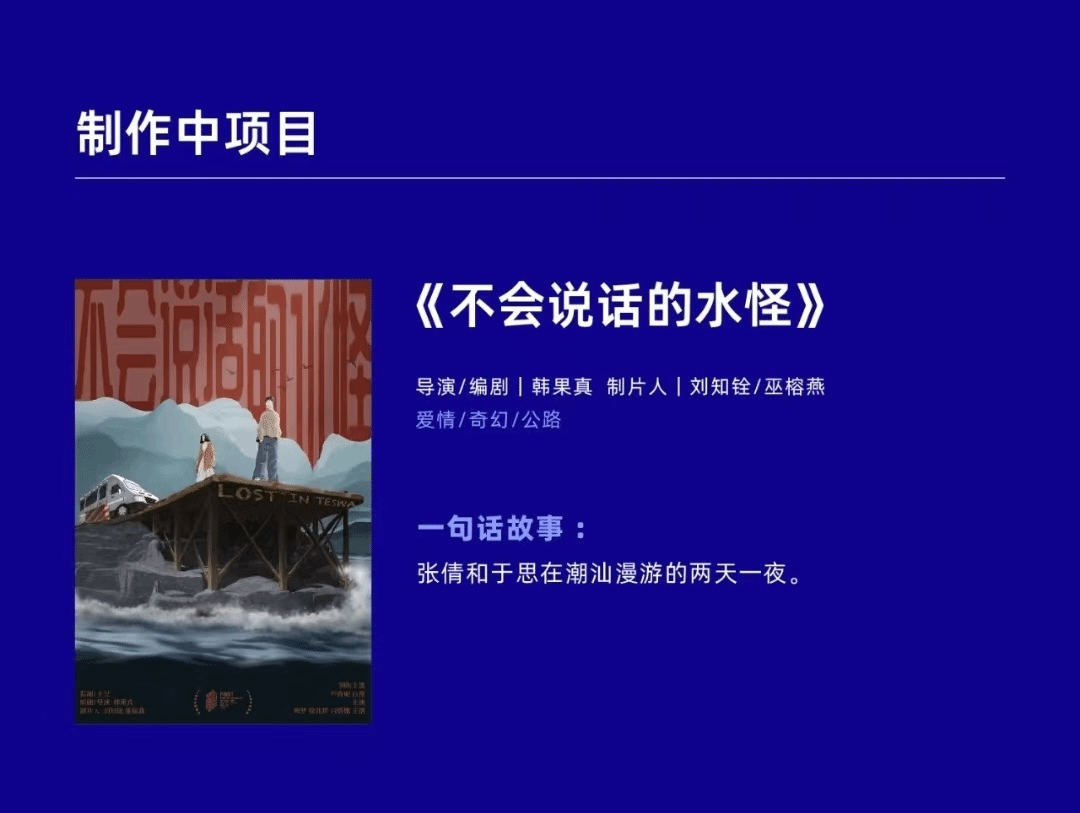 《不会说话的水怪》由韩果真执导,刘知铨、巫榕燕制片。影片讲述张倩与于思相恋五年,以改装房车做公路旅行文身生意。三年旅途后,两人因年龄差异对未来规划产生分歧:于思想卖掉房车筹备文身店,他们驱车前往南澳岛交付车辆,将这趟旅程作为告别过去的最后一站。