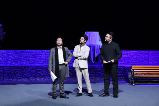 《破晓之龙潭三杰》的创作与演出,是“融道于艺”品牌理念的集中彰显与创新升级。该剧由我校播音主持艺术学院胡桐担任总导演、编剧,薛丹担任制作人,创作全程由传播、播音、表演、设计等多个专业师生共同主导,实现跨学科、跨领域的智慧聚合。为确保剧目既忠于历史真实,又具备鲜活艺术感染力,师生创作团队历时数月开展历史考据工作,深入研读“龙潭三杰”相关史料、文献及研究成果,走访党史专家,力求精准还原隐蔽战线的斗争环境与英雄群像;剧本创作环节,团队既注重再现危机四伏的斗争历程,又着力挖掘英雄人物的内心世界与精神光芒,将当代青年对红色精神的理解与感悟融入其中,实现历史真实与艺术表达的有机统一;舞台呈现上,舞美设计团队运用虚实结合的创作手法,搭配先进的数字媒体音响技术与AIGC视觉效果,构建出兼具年代感与沉浸感的舞台空间,让观众仿佛穿越时空,置身于那个风雨如晦的革命年代。