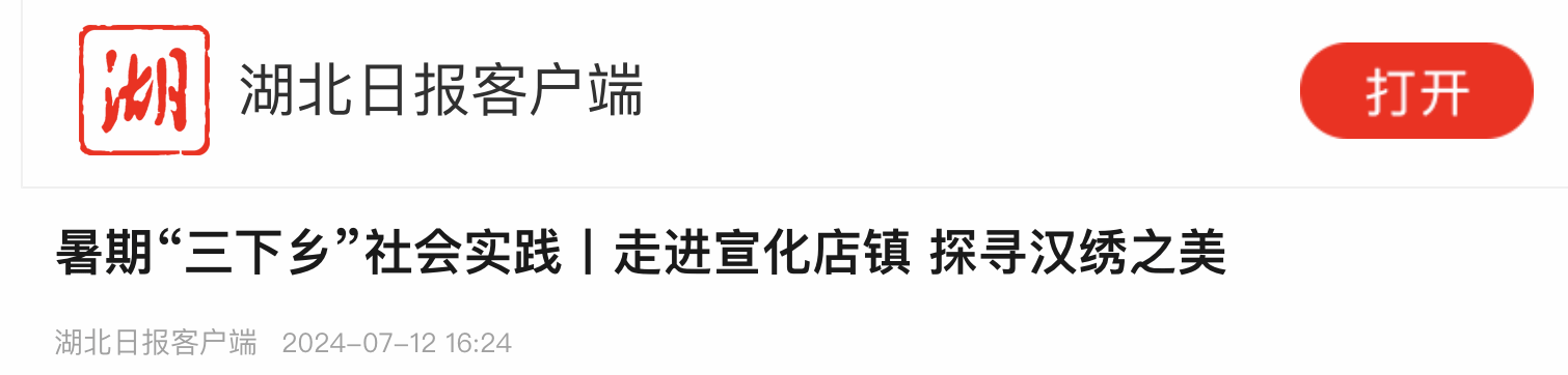 湖北日报客户端讯(通讯员 张坤)2024年7月12日,米兰体育网页版登录传媒技术学院“建设特色乡村,助力美丽大悟”暑期社会实践团队对湖北省孝感市大悟县宣化店镇进行探索,深入学习汉绣这一非物质文化遗产的内涵和独特价值,在实践中增强文化认同感,探寻合适的非遗文化传播方式。