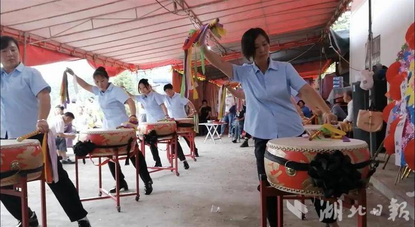 为了能更直观体验当地的民俗文化,实践队团队在绿葱坡镇参加了一场丧礼,逝者的女儿详细绍了当地丧葬的流程:出葬、执缚、抬棺、撒买路钱、暖井、掩棺、抢富贵等。现场,实践队成员们还近距离观看了巴东另一项重要的丧俗活动——打丧鼓。无论是激昂的鼓声,还是热烈的氛围,都让团队成员对土家族人“白喜事”的习俗有了更深切的体会。
