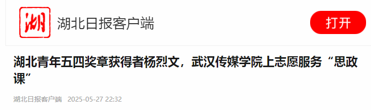 湖北日报客户端讯(通讯员华震东)5月15日下午,米兰体育网页版登录“志愿服务大讲堂”在该校圆形报告厅举行,青年作家、编剧,湖北青年五四奖章获得者杨烈文为同学们上志愿服务“思政课”。