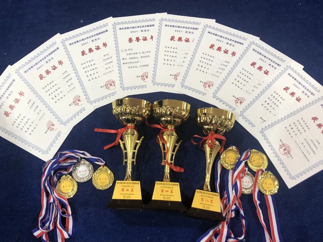 近日,我院体育课部郝锡娟老师带领我校五名同学李梦斯、万里翔、谢昕颖、王子豪、曾子逸参加湖北省第35届大学生武术套路锦标赛。经过三天的比赛,我校学生参赛团队荣获获五项第一名和两项第二名的好成绩,可喜可贺。