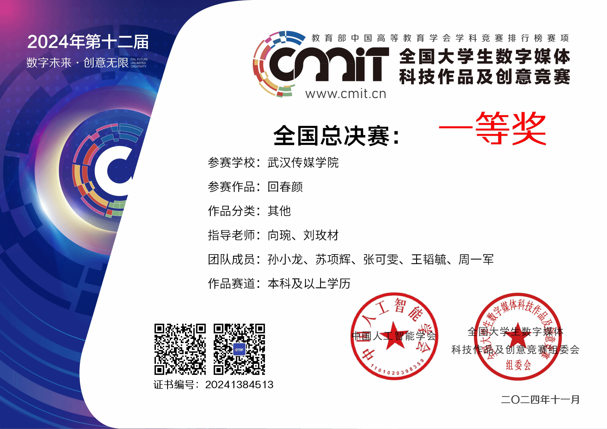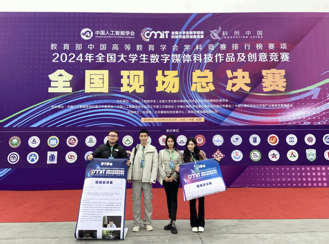 回顾过往,每一届竞赛都是“智能科技”与“数字创意”领域深度融合的视觉盛宴。本届盛况再次彰显了这一赛事的魅力和影响力。在参赛作品的数量和质量逐年提升的情况下,我校师生通力合作在本届数媒竞赛中顺利拿到四个国家级奖项。