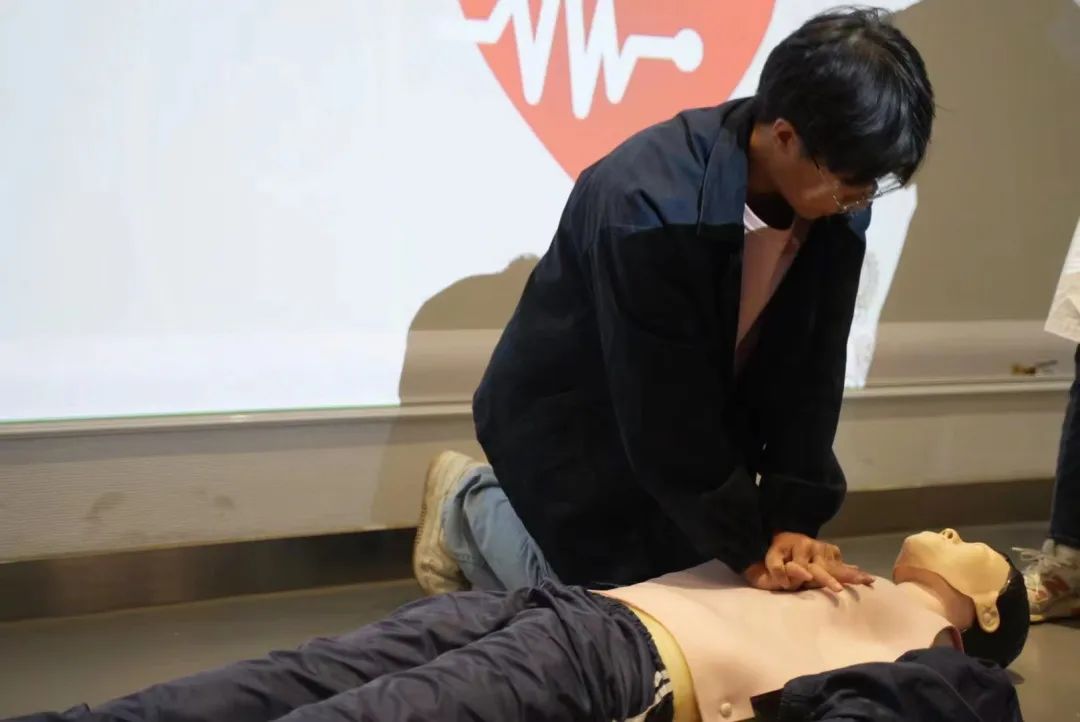 随后卢医生邀请了现场的辅导员以及学生代表们一同上台,进行心肺复苏的实际操作,并为积极参与的同学送上了小礼物。