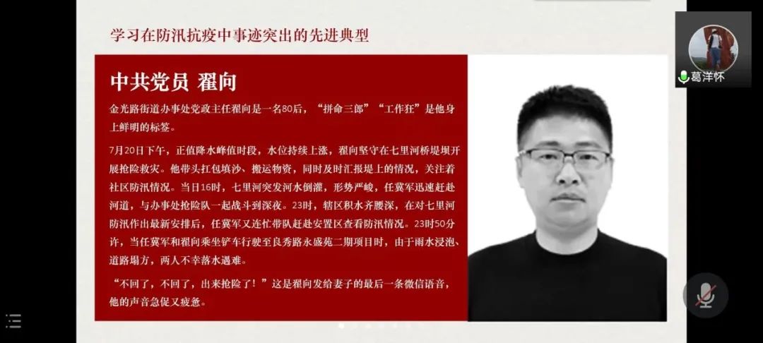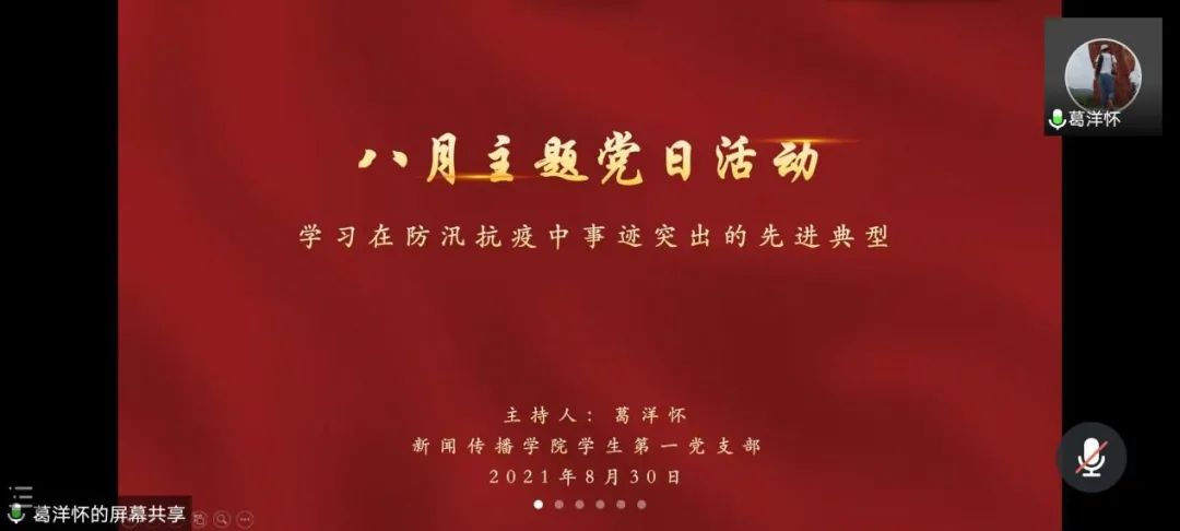 8月30日,新闻传播学院学生第一党支部八月主题党日活动在腾讯会议平台召开。本次党日活动的主题为“学习在防汛抗疫中事迹突出的先进典型”。葛洋怀同志担任会议主持,新闻传播学院学生第一党支部全体党员参加会议。