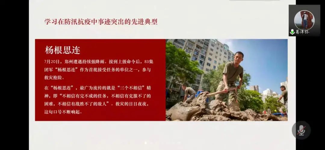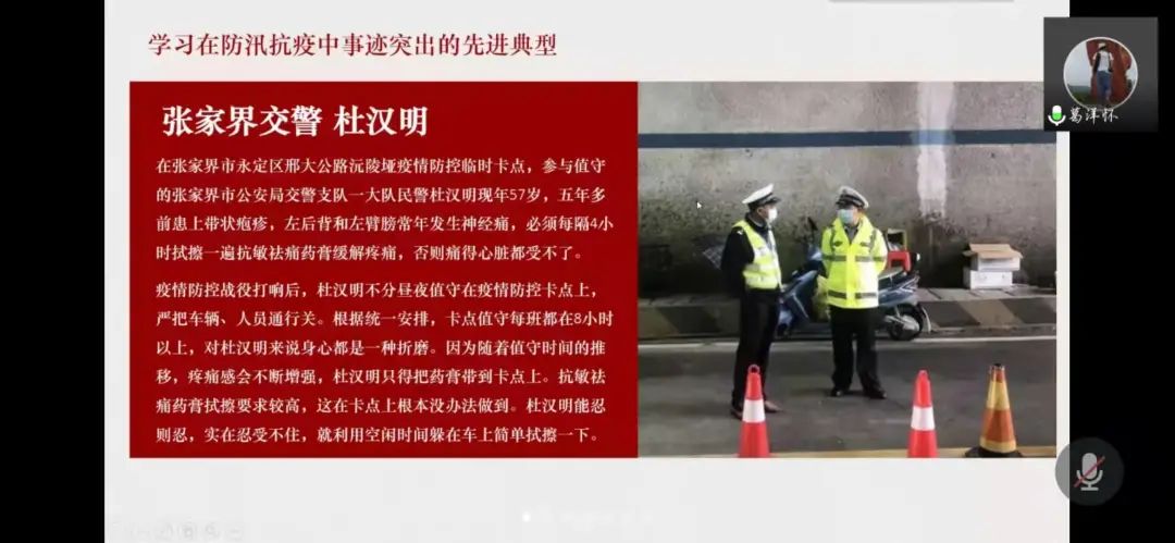 其次,葛洋怀同志,带领全体同志学习了防汛抗疫战役中事迹突出的先进典型,从团体代表杨根思连,到个人代表中国共产党党员任冀军、中共党员翟向,中共党员马新喜,张家界交警杜汉民、村支书代之归,深刻了解了共产党员在防汛抗疫战役中的突出事迹,并呼吁全体同志尊党敬党爱党。