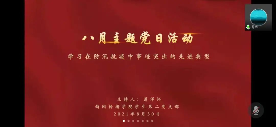 (图|文 郝程)8月30日,新闻传播学院学生第二党支部全体同志通过腾讯会员在线上开展了“学习在防汛防疫中事迹突出的先进典型”八月主题党日活动。