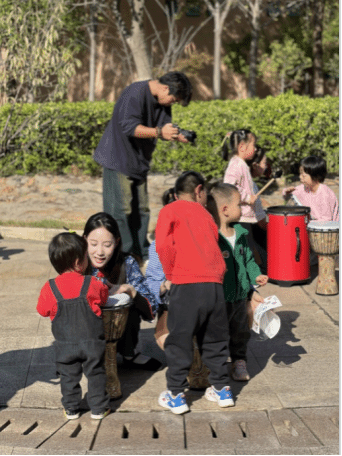 在儿童福利院的小广场,以天为幕,以地为台,同学们为孩子们表演了原创音乐课本剧《卖报童》,该剧由沈洁老师指导学生创编,以小学音乐课本为基础,以武汉小报童为历史原型,运用奥尔夫乐器、歌唱、舞蹈律动、声势律动等音乐元素表现报童们在艰苦的条件下携手同行、互帮互助的情景,塑造天真活泼的报童形象,反映旧社会报童不幸的童年生活,又表现了他们积极向上、对光明的未来充满希望的乐观主义精神。现场同学们的演出真情投入,获得了孩子们的热烈欢呼和掌声,还有孩子情不自禁地走上前去跟同学们一起舞蹈,沉浸在快乐和幸福中。用音乐讲好中国故事,展演红色课本剧,与福利院的孩子们一起重温经典,感受生命的力量。