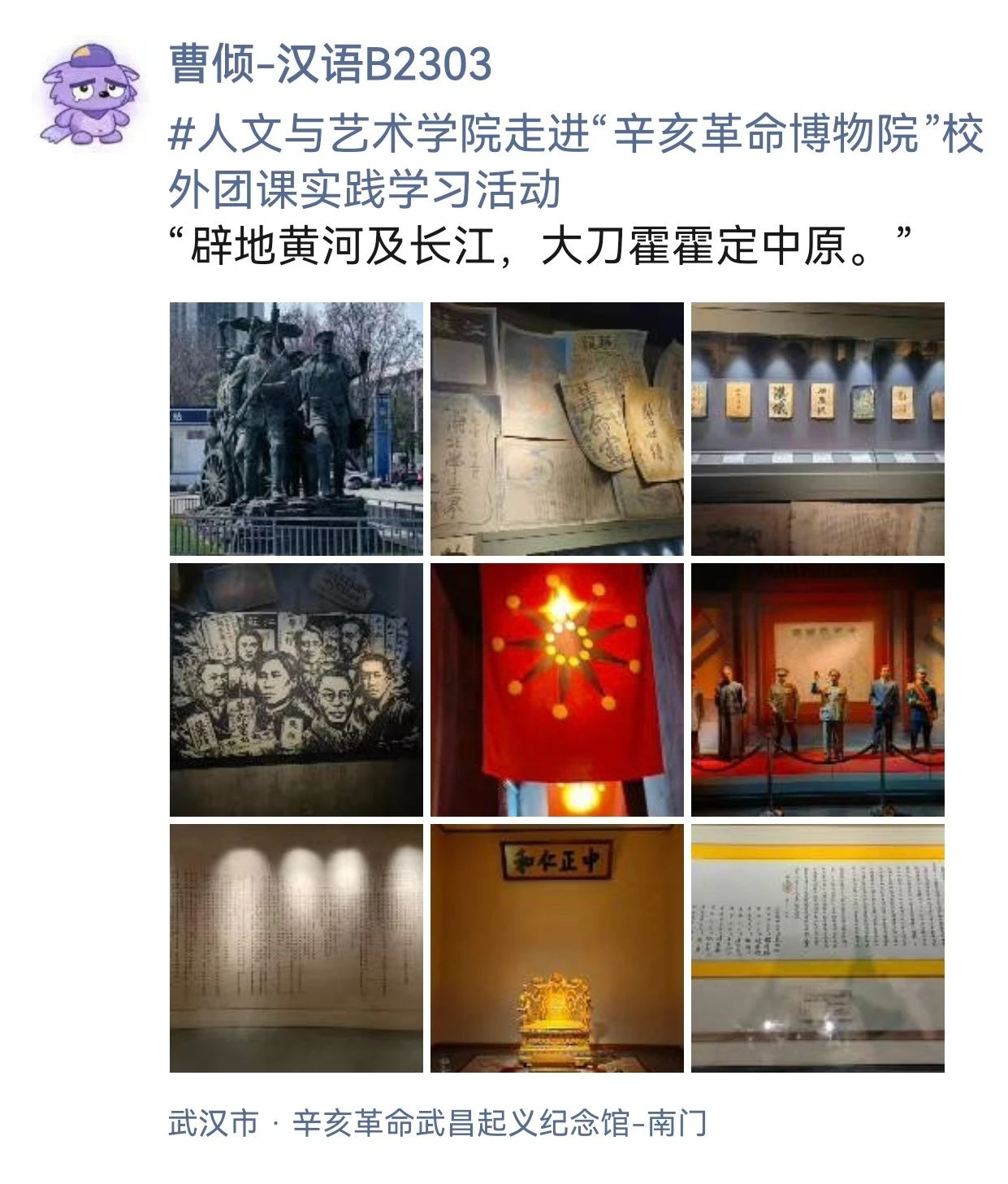 辛亥革命博物馆以声、光、电等高新技术为手段,在大量珍贵文物、历史照片以及“武昌首义”等逼真场景中,重证历史事件和细节、重现历史过程或断面,生动呈现首义之城——武汉百年沧桑巨变的时代新貌。同学们在参观过程中,充分代入历史环境与历史人物,回溯“首义之战”、感恩“革命先驱”、再忆“共和之基”,沉浸式感受沉重历史背景下的艰难选择与不断斗争,感悟辛亥革命的艰难历程和伟大贡献。
