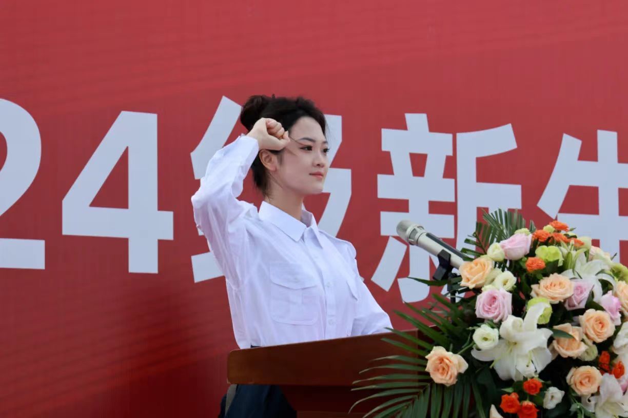 新生代表林铃泠带领全体同学宣誓来自电影与电视学院的林铃泠同学带领大家宣誓:“今天,我佩戴校徽,以青春之名,许下誓言:向阳向上,奋斗以成。生逢盛世,重任担当。我将秉承校训:博雅、崇实、弘志、拓新。勤奋好学,练就本领,勇敢担负时代使命,谱写新时代传媒人的绚丽华章。