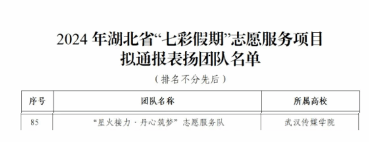 根据团中央、团省委有关部署,2024年暑期,共有来自省内外高校近800余支志愿服务团队在湖北省各“暑假学堂”爱心托管班点位开展实地服务。经过高校团委推报、材料审核、组织评审,我校团委“星火接力·丹心筑梦”志愿服务队突出重围,获通报表扬。