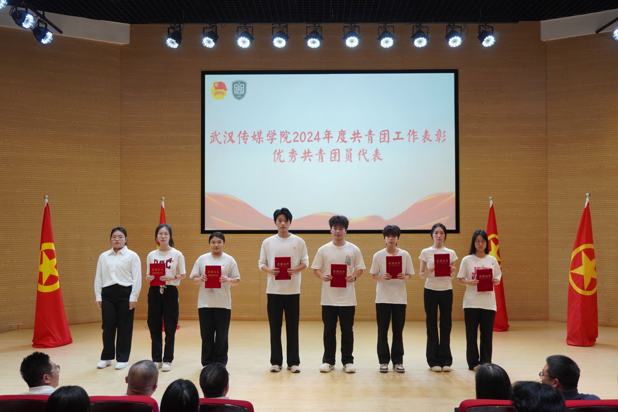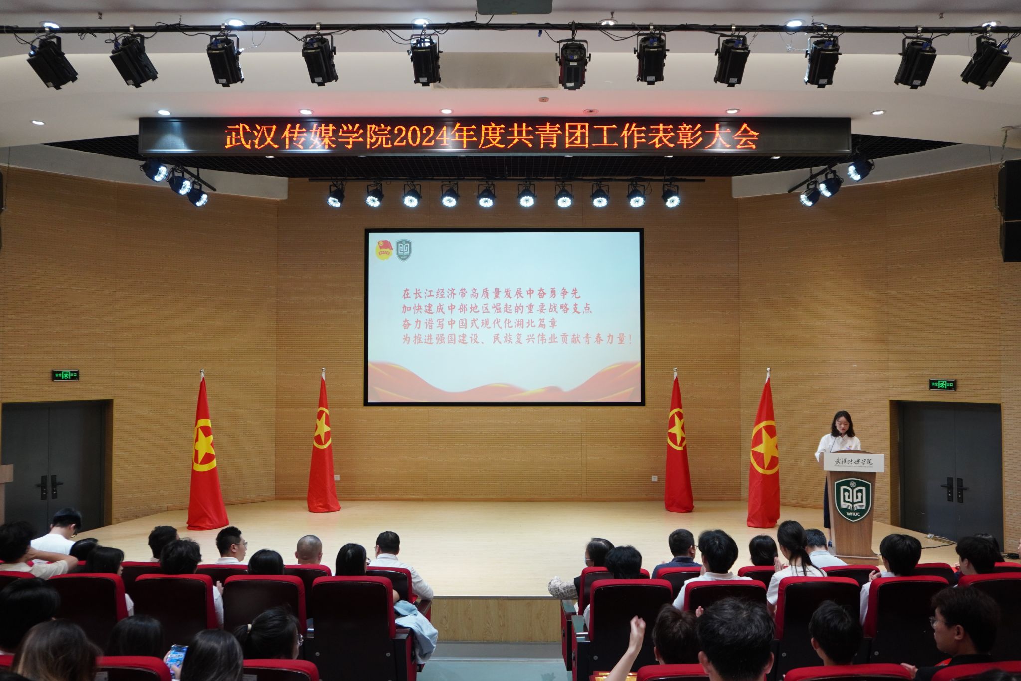 大会在庄严的国歌声中开幕。校团委书记瞿宗巍宣读了《关于表彰2024年度共青团工作先进集体和先进个人的决定》。广电B2302班团支部、播音B2301班团支部等9个团支部荣获“红旗团支部”称号;传播B2203班团支部等27个团支部获“优秀团支部”称号;杨黎冲等103名学生、李思思等9位老师获评“优秀共青团干部”;甘诗怡等289名同学获评“优秀共青团员”;张娟等78名同学获评“优秀学生干部”;熊恋令等113名同学因志愿服务表现突出获评“优秀志愿者”称号。播音主持艺术学院学生会、电影与电视学院学生会荣获“优秀学生会”称号,播音主持艺术学院团委、电影与电视学院团委荣获“优秀基层团委”称号。校领导为获奖代表颁奖,现场掌声热烈。