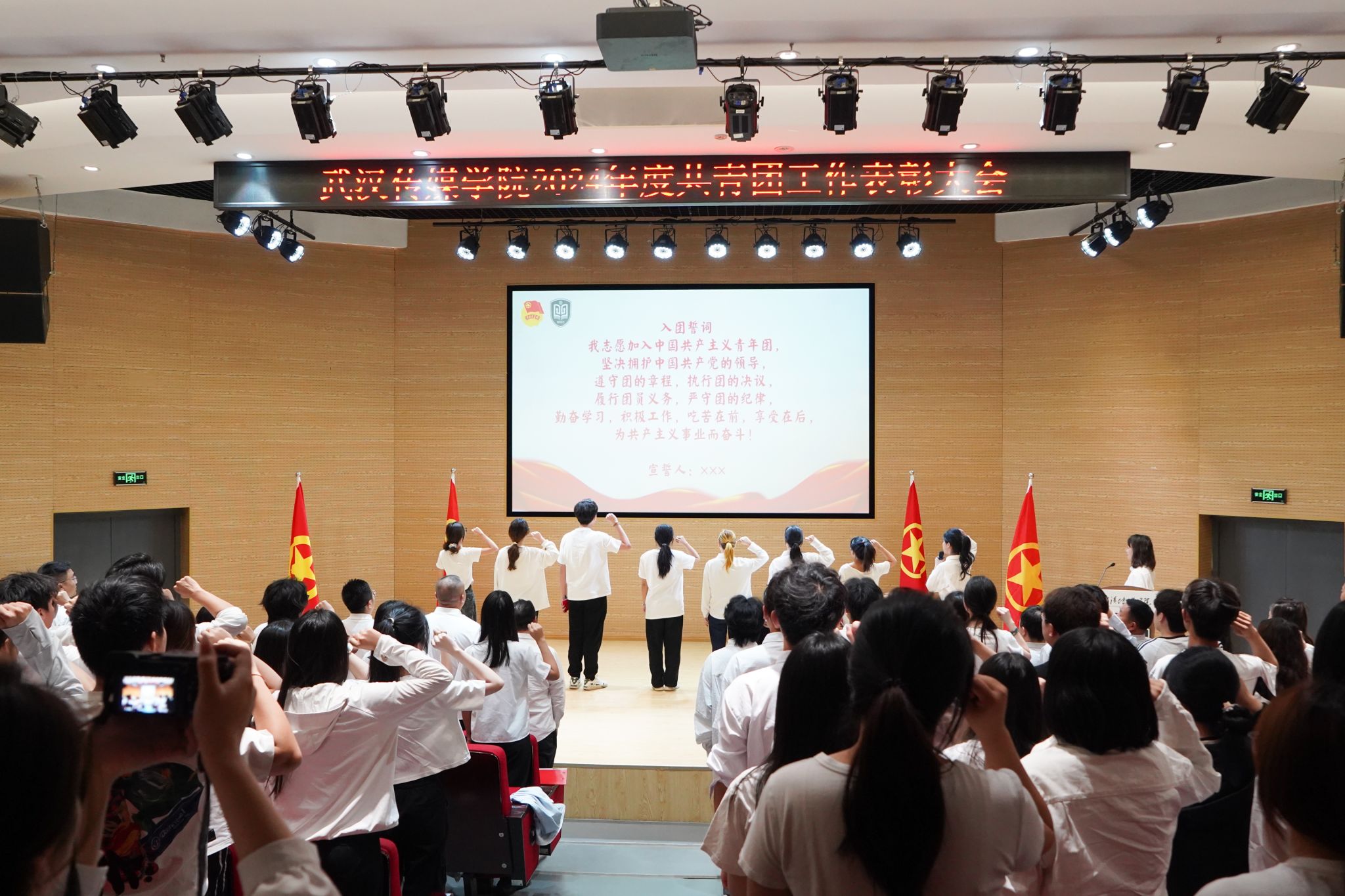 大会还举行了新团员入团仪式。在团旗下,新团员代表上台宣誓,老团员代表张馨予领誓。全体新团员用铿锵誓言表达对共青团组织的热爱和忠诚,增强了新团员的荣誉感和责任感,也激发了老团员的使命感。