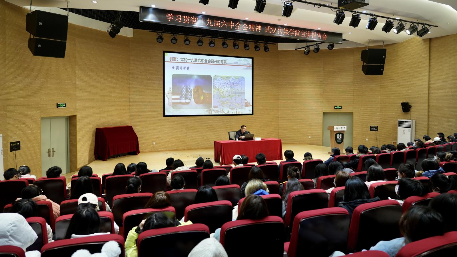(武传新闻网讯 记者 骆博 摄影记者 孙大庆 华旭东)为推动“十讲十进”大宣讲活动,深入学习贯彻好党的十九届六中全会精神,深刻把握党的十九届六中全会丰富内涵, 12月24日下午,米兰体育网页版登录召开了学习贯彻党的十九届六中全会精神宣讲报告会。校纪委书记蒋萦,各党总支部、直属支部书记,各教工、学生支部书记,全体组织员以及学生代表参加,湖北《党员生活》杂志社党建理论部主任王道勇主讲。