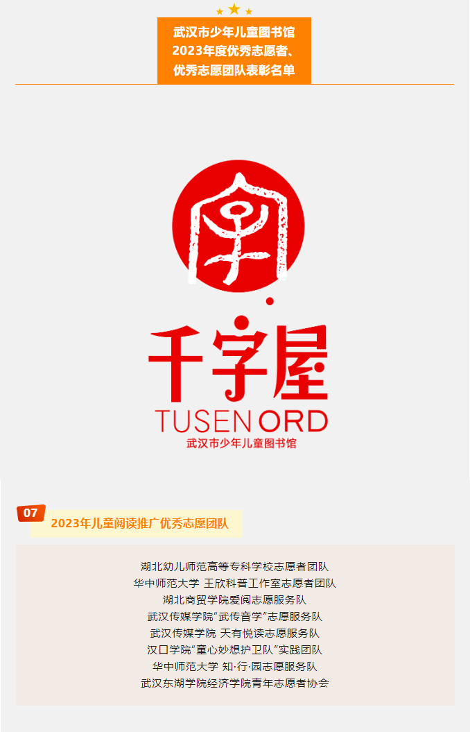 2023年12月17日上午,“亲子共读·陪伴是最美童年”活动年度展示暨武汉市少年儿童图书馆志愿者颁奖典礼活动在中南剧院举行,米兰体育网页版登录人文与艺术学院音乐学专业“武传音学”志愿服务队受邀参加,并喜获“2023年儿童阅读推广优秀志愿团队”称号。