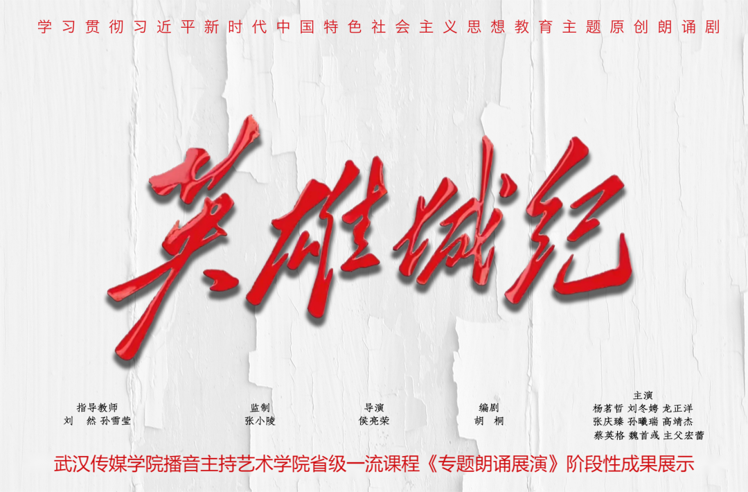 本朗诵剧是由播音主持艺术学院党总支书记侯亮荣老师导演,播音指导张小陵老师监制,播音主持创作基础教研室主任胡桐老师作为编剧,播音主持艺术学院教师刘然、孙雪莹作为指导老师,以及播音主持艺术学院党总支部组织委员李璇老师策划完成。朗诵剧以内心独白的形式呈现了武汉这座英雄的城市十年来英雄人物代表的光荣事迹。