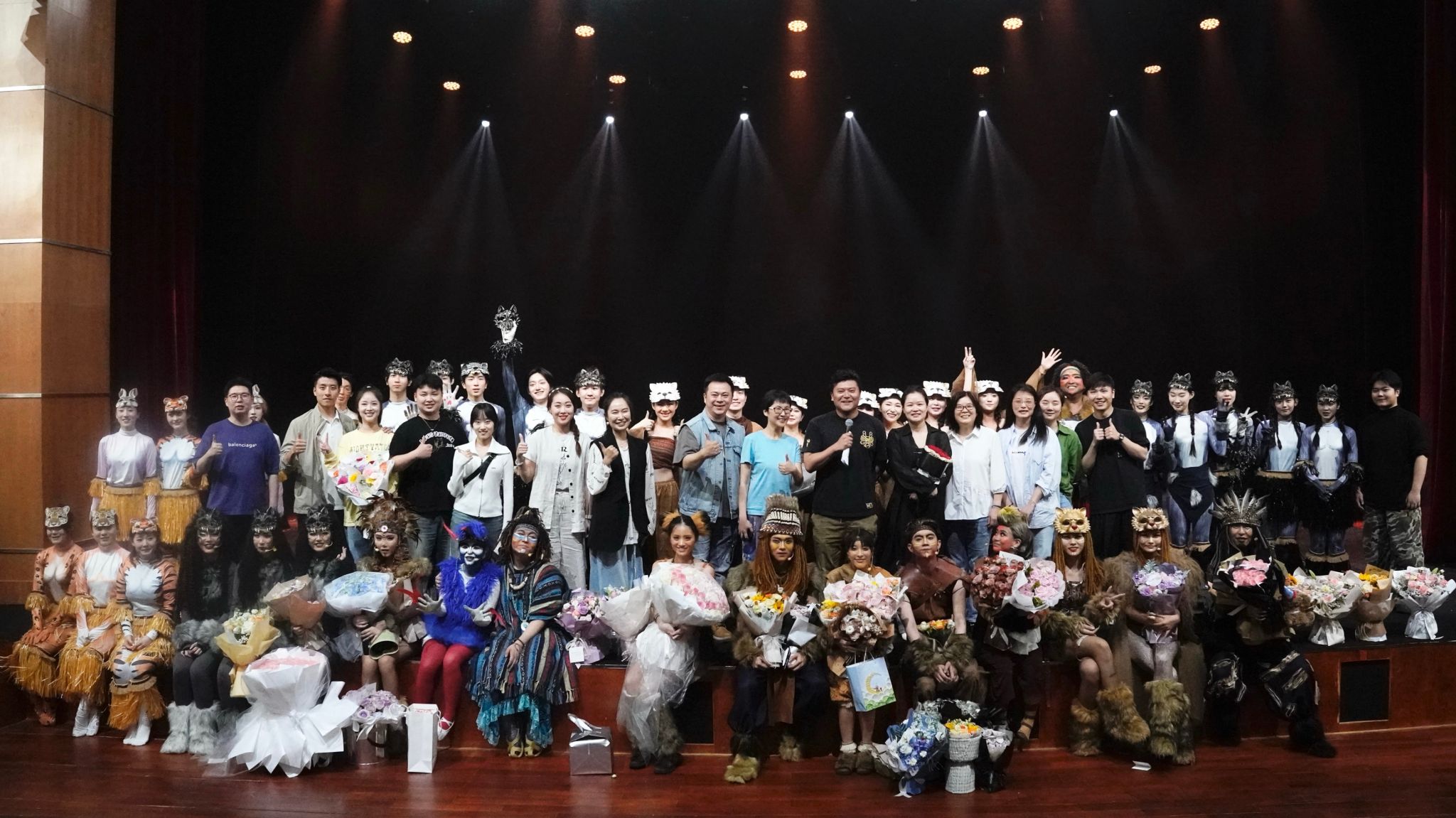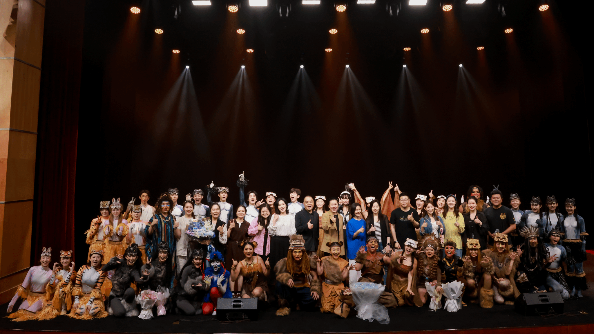 舞美设计马莉老师则分享了她的设计理念:“在整个剧目的舞美设计中,我以‘抽象化非洲草原的生命力与戏剧冲突’为核心,紧扣剧本的奇幻与成长主题。例如,舞台通过双面翻转道具和软景设计,道具背面采用荣耀石肌理,翻转后变为流亡荒漠的大象墓园,既节省空间,又隐喻辛巴从天真到觉醒的双重世界。象征性视觉语言、动态群舞与静态装置的对比,以及群舞动态叙事都从剧目主题出发,赋予舞台强烈生动的戏剧张力。”