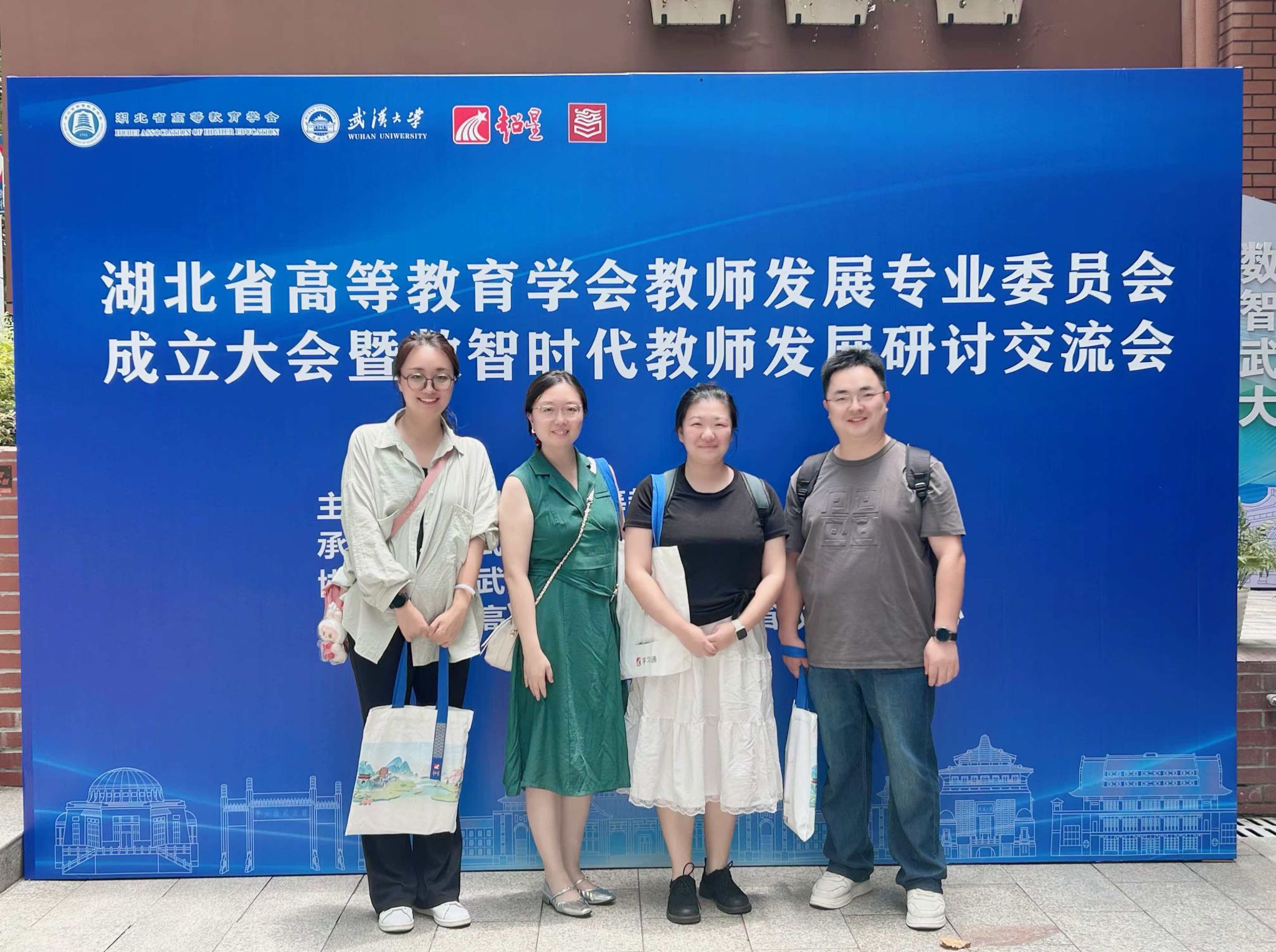 7月12日,湖北省高等教育学会教师发展专业委员会成立大会暨数智时代教师发展研讨交流会在武汉大学举行。教师发展中心赵一楠、校级培训师团队成员,创新创业学院院长蒋冬青教授、设计学院副院长张旭教授及播音主持艺术学院辛逸乐教授出席会议。