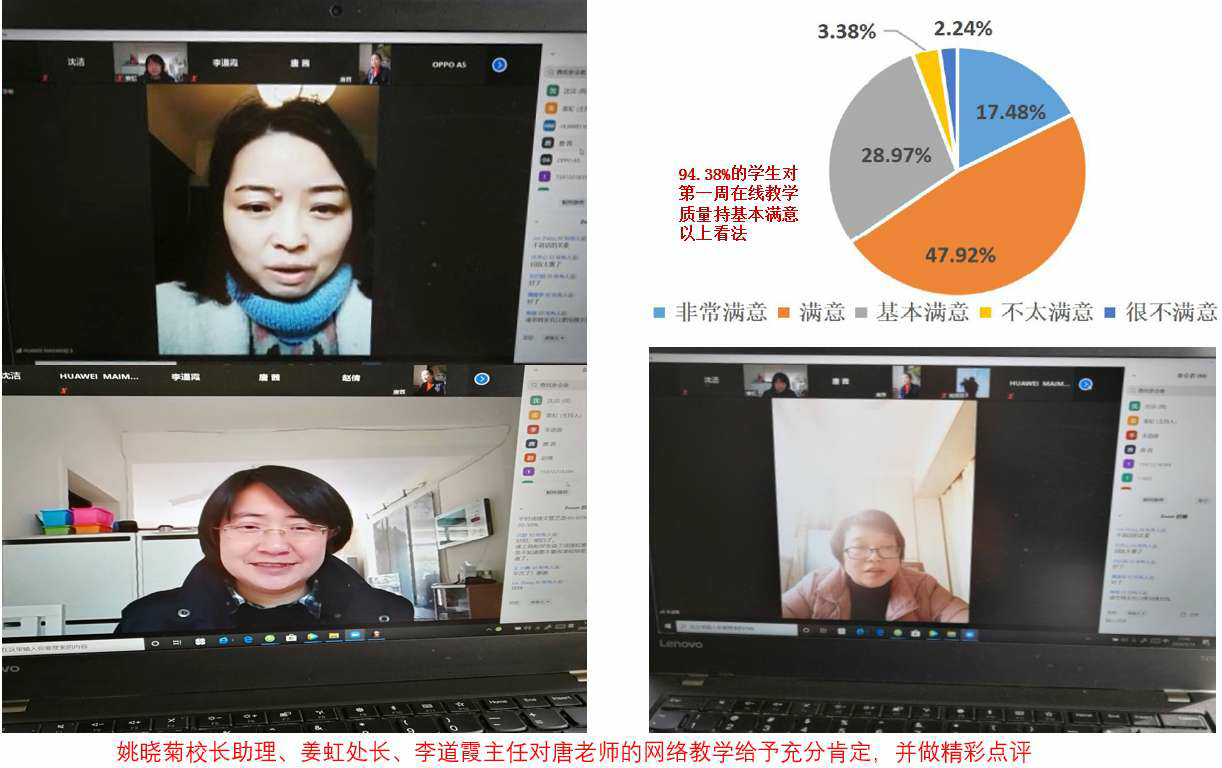 在学校领导的提前筹划和部署下,我校在线教学开始较早,在近一个月的教学运行中,教学督导与评估中心及时进行了质量监控,中心的听课和调查显示,94.38%的学生对第一周在线教学质量持基本满意以上看法,95.03%的学生对学校在线教学的组织工作持基本满意以上。在统一开学前,我校将继续举办在线教学培训和优秀教师公开课分享会,让更多老师分享线上教学经验,形成“爱教、乐教、研教”的良好氛围,促进我校整体教学质量的提升。