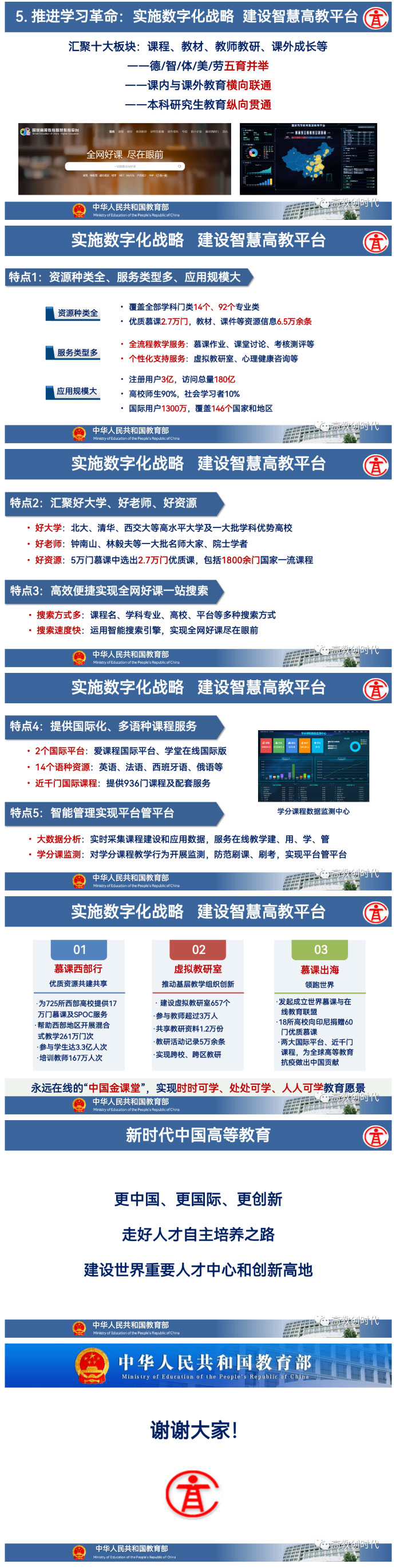 实施数字化战略,建设智慧高教平台。今年3月份已经推出了国家高等教育智慧平台,这个平台包括十大板块:课程、教材、教研、课外成长,是一个德智体美劳五育并举,课内和课外教育横向联通、本科研究生纵向贯通的中国国家高等教育智慧平台。